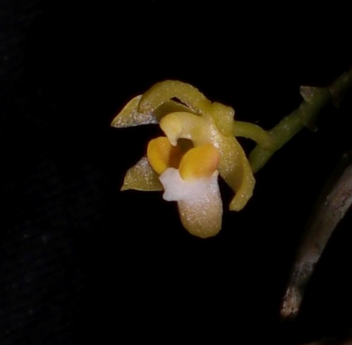 Found in the Philippines at elevations around 60 meters as a mini-miniature sized, hot growing epiphyte with a thick stem carrying 2 ranked, leathery, oblong-lanceolate, unequally notched apically, erect to recurved leaves with overlapping leaf sheath bases that blooms in the spring on a thick, smooth, racemose, loosely few flowered inflorescence