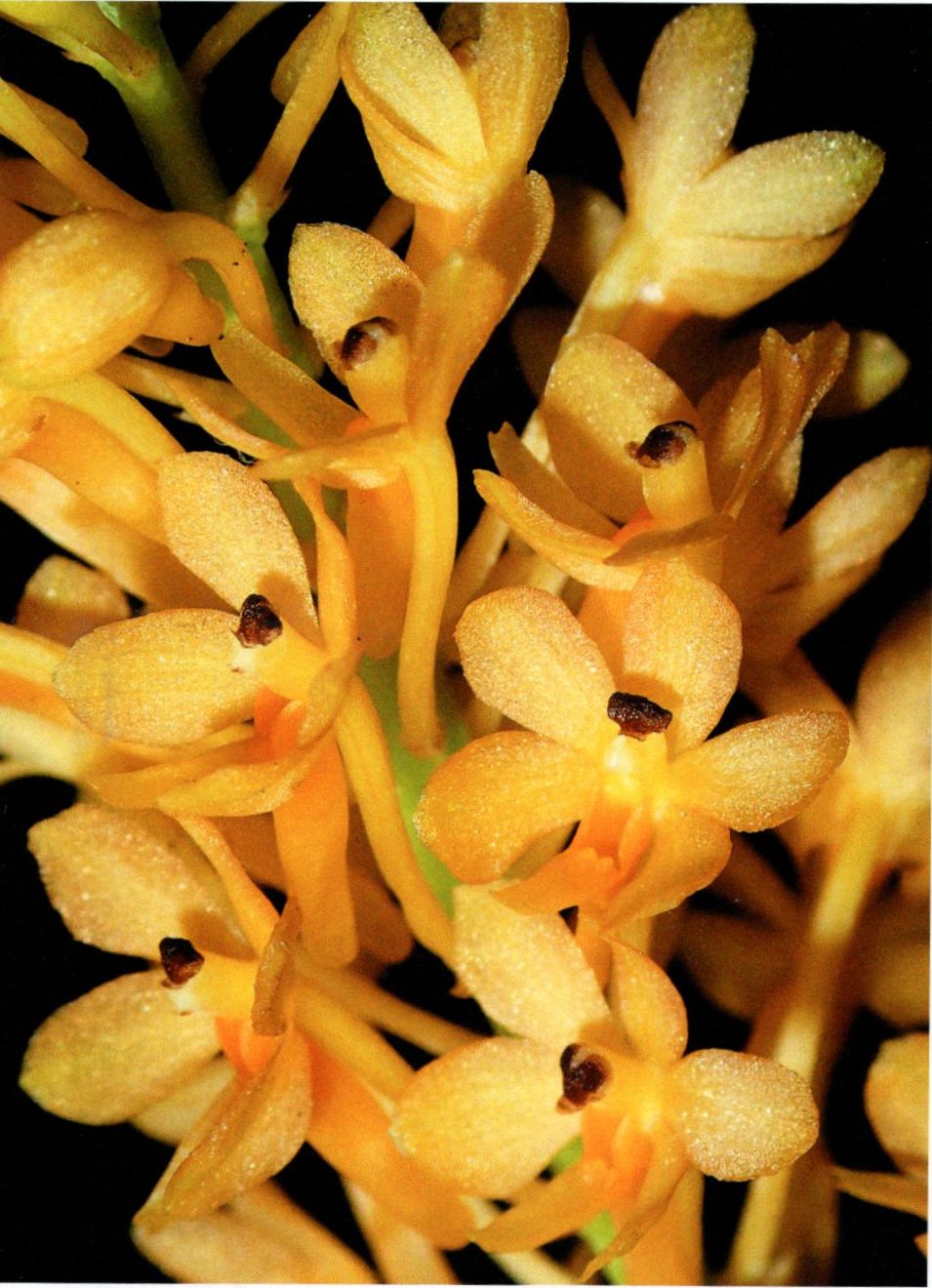 Found on Maratua island to the east of Kalimantan Borneo at elevations around sea level as a small sized, hot growing epiphyte with a monopodial stem carrying distichous, linear, apically erose leaves that blooms in the fall on an erect, 4" [10 cm] long, many flowered inflorescence