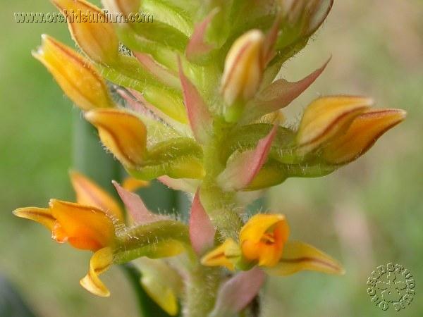 Found in Minas Gerais, Espiritu Santo and Rio Grande do Sul states of Brazil as a small sized, cool growing terrestrial with an erect leafy stem carrying elliptical, acute, gradually narrowing below into the petiolate base leaves that blooms on an erect, 4"[10 cm] long, densely many flowered, conical inflorescence with broadly lanceolate, acute, as long as the flower floral bracts