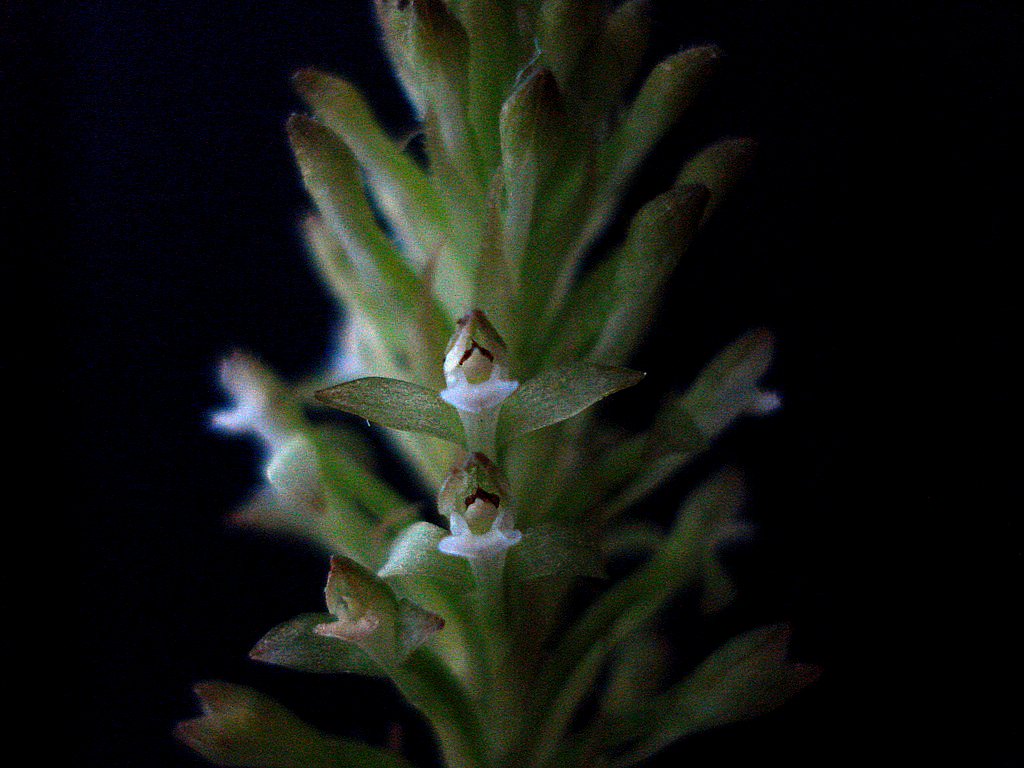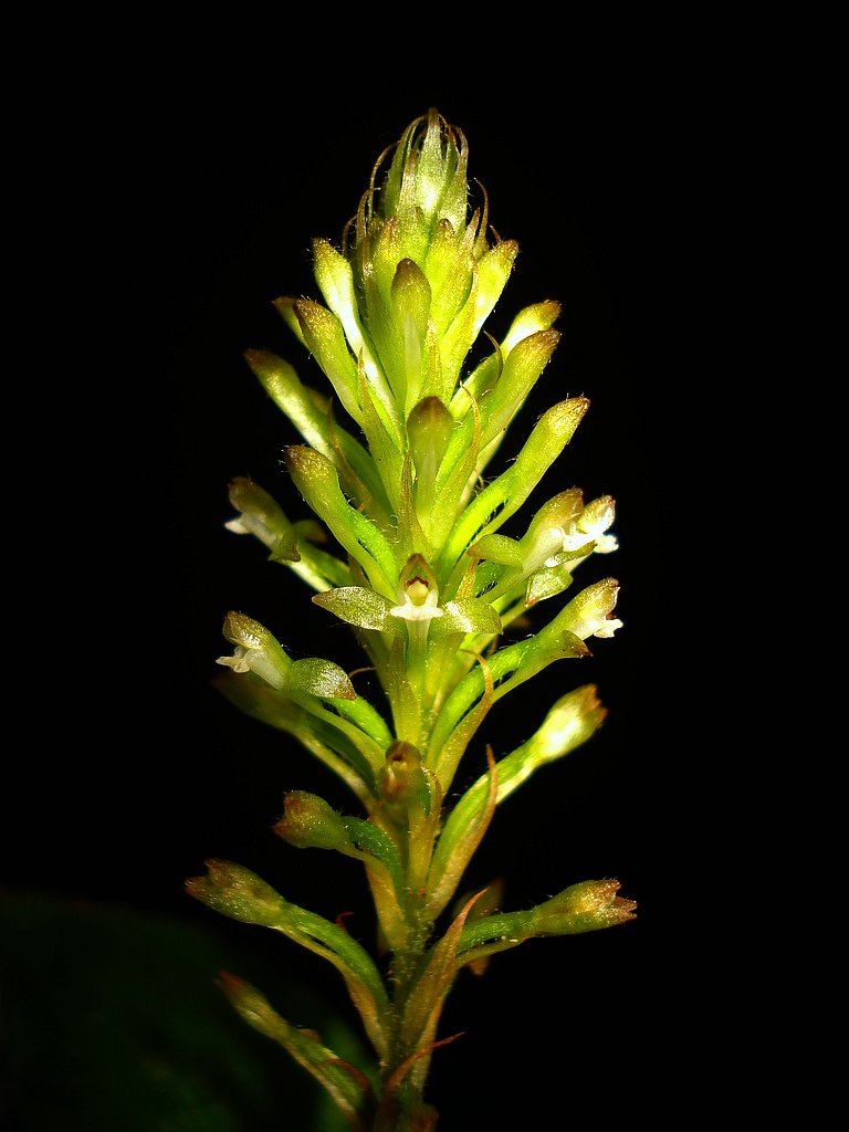 Found in Venezuela and Ecuador at elevations around 400 to 1095 meters as a miniature sized, hot to warm growing terrestrial orchid with a decumbent, becoming erect stem carrying above the middle, 4 to 6, elliptic, acute, petiolate base leaves that blooms on a terminal, erect, 3 [7.5 cm] long, several flowered inflorescence with lanceolate, longly acuminate, concave, sparsely ciliate floral bracts