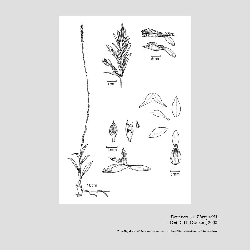 Found in Pastaza Ecuador at elevations around 2700 meters as a giant sized, cold growing terrestrial orchid with a repent becoming erect stem carrying in a spiral, dark green, narrowly elliptic-ovate, acute, gradually narrowing below into the petiolate base leaves that blooms in the summer on an erect, terminal, to 9" [22.5 cm] long peduncle, rachis to 8" [20 cm] long, many flowered inflorescence