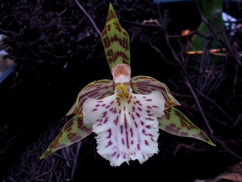 Found in Brazil, Venezuela and Colombia in moist forests at elevations of 200 meters as a small sized, hot growing epiphyte with a creeping, slender, bracteate rhizome and laterally strongly flattened, ellipsoid to oblong, glossy light green pseudobulbs that become lightly sulcate with age, subtended by 2 to 3 leaf bearing sheaths and carrying one or two, apical, glabrous, subcoriaceous, lanceolate to ligulate, acute, basally conduplicate and articulate leaves, blooming in the spring and summer on an ascending, few to several flowered, to 10" [25 cm] long, racemose inflorescence that gives rise to a few, successively opening, fragrant flowers This terrestrial orchid grows in hot temperatures with high humidity and moderate shade. After flowering a short 1 to 2 month rest is beneficial, resume watering and fertilizer with the onset of new growth and flowers best if given very cramped quarters in a small pot.