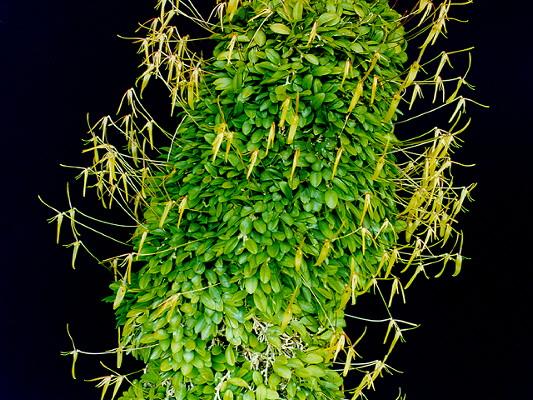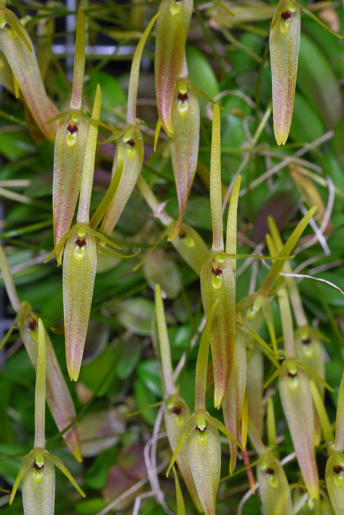 Found in Sao Paulo state of Brazil as a mini-miniature sized, warm to cool growing epiphyte in very wet, primary forests with an erect ramicaul carrying a single, apical, erect, coriaceous, light green, subulate, gradually narrowing below into the petiolate base leaf that blooms in the spring on an erect, 3" [7 cm] long, single flowered inflorescence that is held above the leaves.