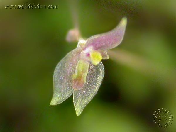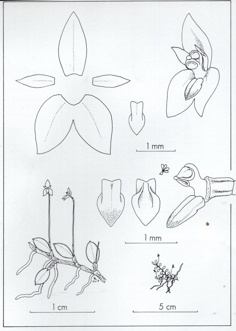 Found in southeastern Brazil as a mini-miniature, creeping, mat forming, warm to cool growing epiphyte with a creeping rhizome giving rise to a short ramicaul enveloped by an acuminate sheath and carrying a single, ovoid, gradually narrowing below into the short petiolate base leaf that blooms in the spring on a 1/2" [1.25 cm] long single flowered inflorescence that holds the flower well above the leaf.