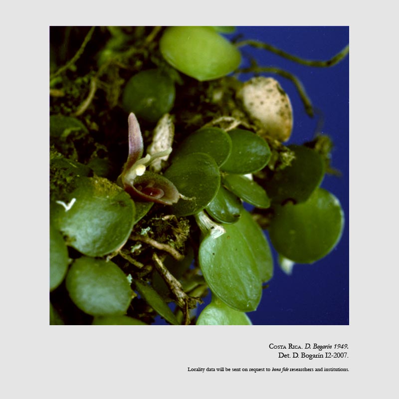 Found in Costa Rica, Panama, Venezuela, northern Brazil and Ecuador in lower montane to montane cloud forests at elevations of 700 to 1300 meters as a mini-miniature sized, warm to cool growing, repent and mat-forming epiphyte with a suborbicular, fleshy leaf held flat against the substrate and blooms on an erect, short, single flowered inflorescence with several, imbricating, basal, triangular bracts.