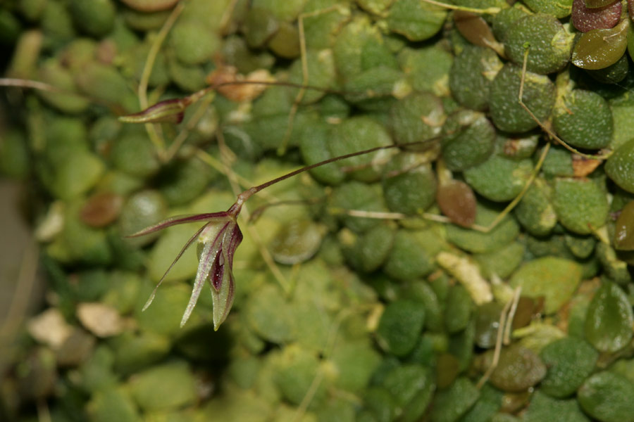Found in Espirito Santo state of Brazil in humid forests at elevations around 1000 meters as a mini-miniature sized, warm to cool growing epiphyte with a slender, elongated, occasionally branching rhizome giving rise to an ascending ramicaul enveloped by a thin tubular sheath and carrying a single, prostrate, thickly coriaceous, suborbicular to elliptical, apex entire, obtuse to rounded, rounded and contracted below into the nearly absent petiolate base leaf that blooms in the later summer on a slender, erect, .6 to .75" [1.5 to 1.8 cm] long, single flowered inflorescence with a minute bract below the middle and an oblique floral bract that envelops the pedicel.