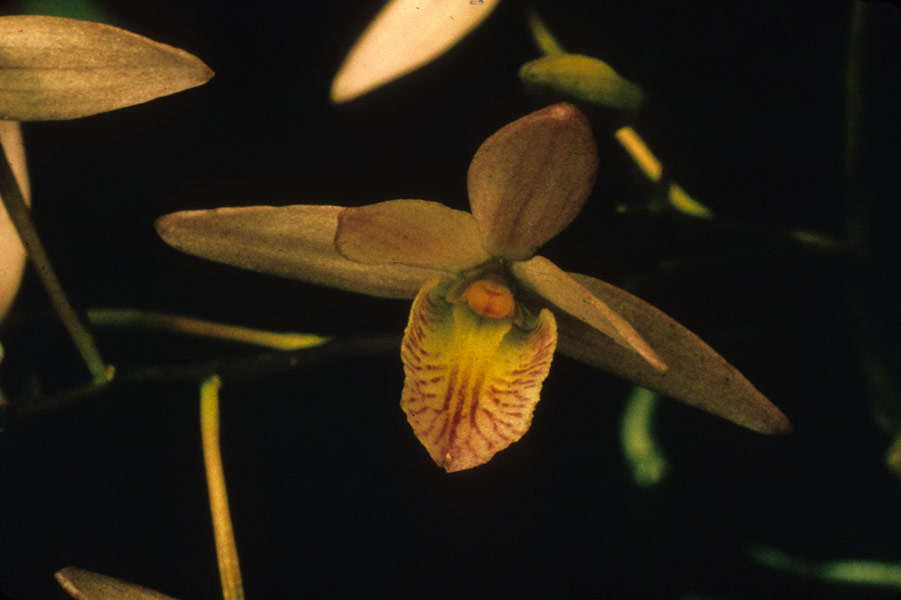 Found in Michoacan state of Mexico along streams in tropical deciduous forests at elevations of 700 to 1100 meters as a small to medium szied, warm to cool growing epiphyte with stalked, fusiform pseudobulbs enveloped by scarious sheaths and carrying erect, coriaceous, linear-lanceolate, acuminate, deciduous leaves that blooms in the winter and early spring on a terminal, 4" [10 cm] long, paniculate, 5 to 30 flowered inflorescence