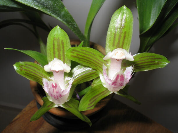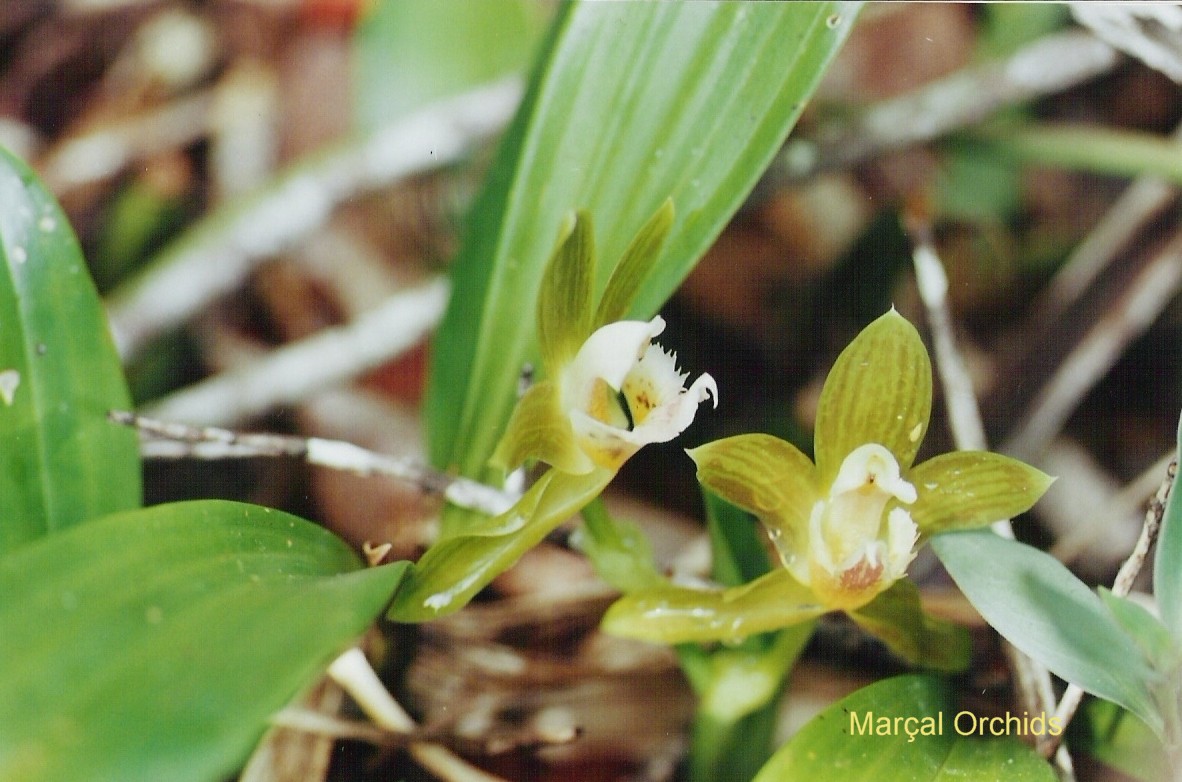 Found in the Guyanas, Peru and interior Brazil at lower elevations as a small to medium sized, hot to warm growing epiphyte with an elongate rhizome partially enveloped by dry sheaths carrying large, tetragon, sulcate pseudobulbs enveloped basally by 2 sheaths and carrying 2 apical, coriaceous, oblong-lanceolate, acute, plicate leaves that blooms in the late spring on an erect, 1 or 2 flowered, to 8" [20 cm] long, inflorescence that is shorter than the leaves.