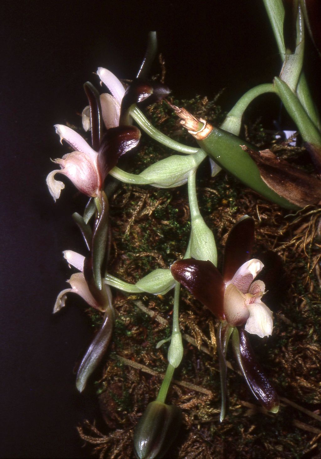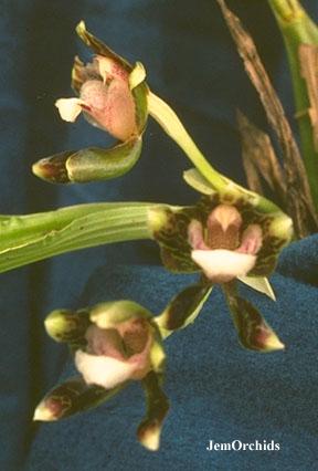 Found in Colombia, Venezuela, Ecuador, Peru and Bolivia in moist virgin forests as a large sized, caespitose, hot to cool growing epiphyte about 15 to 25' up on trunks in dense shade that has cylindric, 4-sided, glossy, olive green pseudobulbs subtended by a few, short, scarious sheaths and carrying 2, deciduous, elliptic-lanceolate, several nerved, petiolate, acuminate leaves occurring at altitudes of 200 to 1200 meters in dense shade where it blooms in the spring on a arcuate to pendant, basal, terete, pale green-white, 8" [20 cm] long, few [2 to 7] flowered, racemose inflorescence arising with a new pseudobulb growth with large, hooded, pale green floral bracts and holds the fleshy, longlasting, fragrant [not pleasing] flowers below the leaves.