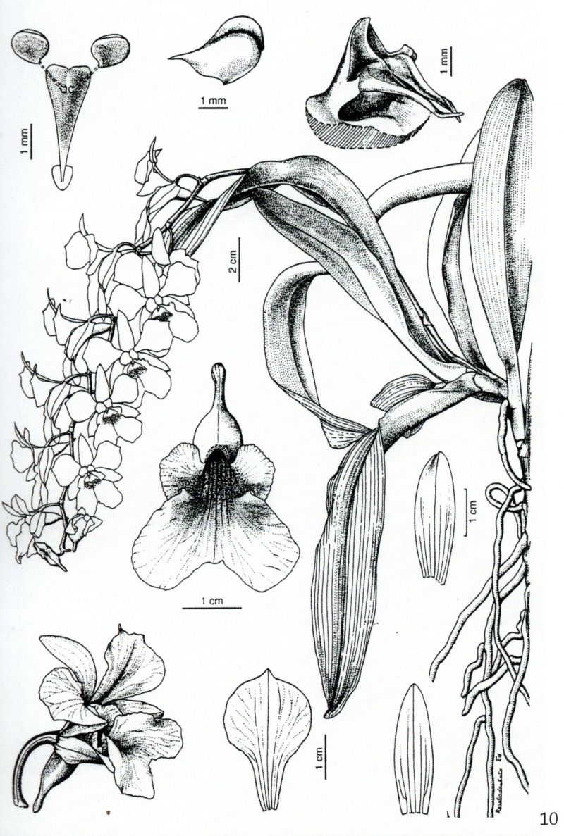 Found in eastern Madagascar in humid foress at elevations of 900 to 1000 meters as a small sized, warm growing epiphyte with a thick, slightly flattened stem carrying to 10, loriform, conduplicate basally, flattened above, emarginate apically leaves that blooms on an axillary, peduncle provided with 2 short sheaths, to 16" [40 cm] long, 10 to 15 flowered inflorescence.