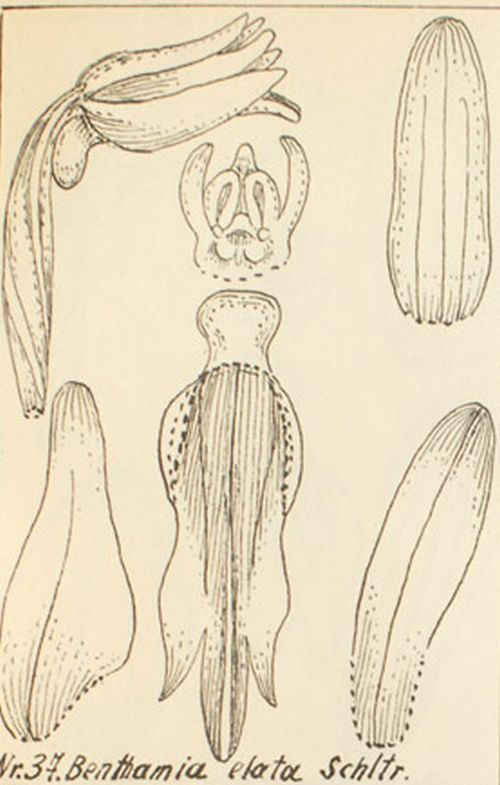 Found in south central Madagascar at elevations of 750 to 1200 meters as a large sized, warm to cool growing terrestrial with an erect stem carrying in the lower half, 5 to 6, narrowly ligulate to oblanceolate, acuminate-obtuse, leaves and 4 to 6, lanceolate-acuminate sheaths above that blooms in the winter and earlier spring on an erect, [30 to 37.5 cm] long, rachis to 8" [20 cm] long, cylindrical, elongated, densely many flowered inflorescence with narrowly acuminate, slightly longer than the flowers floral bracts