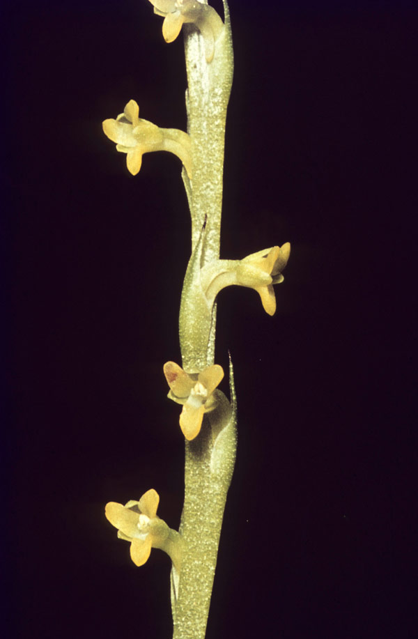 Found in south central and south eastern Madagascar in montane scrub and grassland moss and lichen rich forests or rock crevasses at elevations around 1600 to 2600 meters as a small sized, cool to cold growing terrestrial with a single, basal, oblong leaf that blooms in the summer and early fall on a spicate, terminal, erect, 3.2 to 6" [8 to 15 cm] long, densely many flowered inflorescence