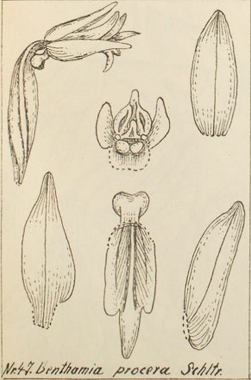 Found in eastern Madagascar in shady spots in forests at eleavtions of 400 to 800 meters as a medium sized, warm growing terrestrial with a stem carrying 4 to 5 linear-lanceolate to linear, acute leaves the superior slightly longer than the bracts that blooms in the later spring on an erect, to 8" [20 cm] long, densely many flowered inflorescence with lanceolate-linear, acute, longer than the flowers floral bracts carrying yellowish flowers