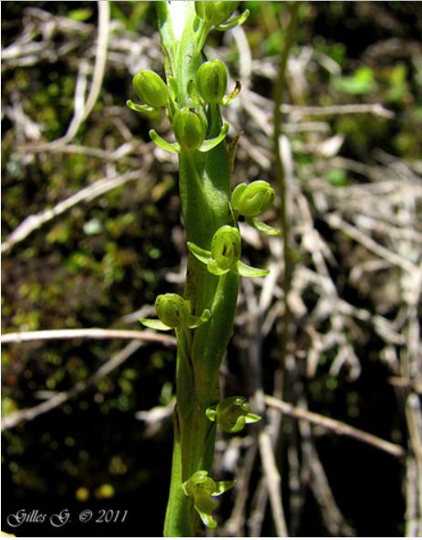 Very similar to B perularioides but this one differs in the 2 radical leaves, the slightly unilateral rachis, the divisions of the flower are slightly longer .16" [4 mm]; the lip is rhomboidal and heavily dilated medially and subtrilobed, the spur is filiform and longer [.2" [5 mm], and the anther is shorter and apiculate. .
