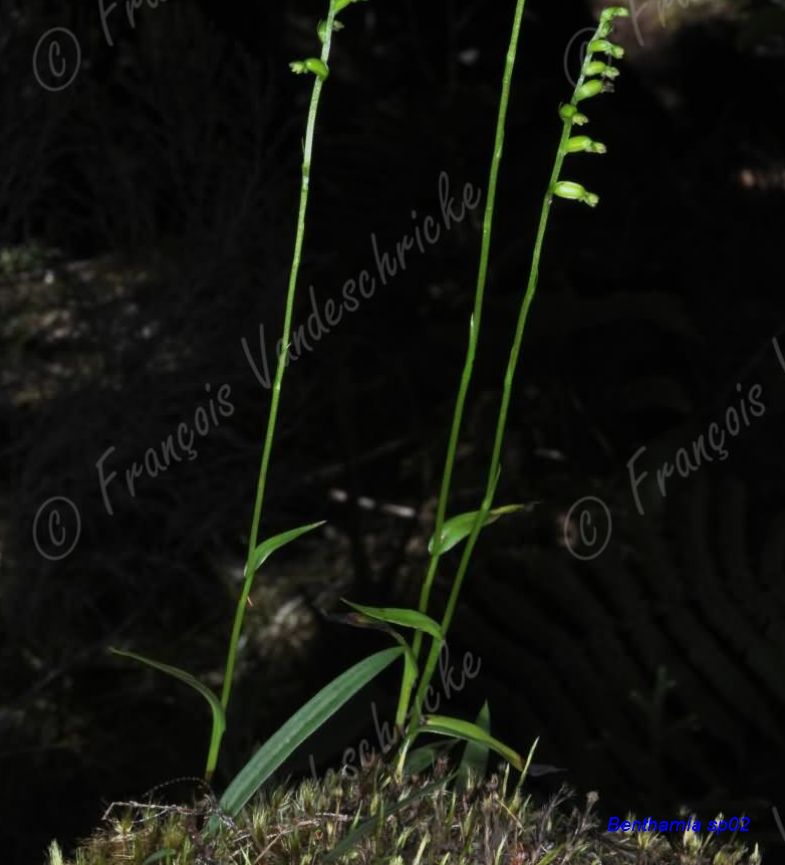 Found in Reunion as a small to medium sized terrestrial with 2 to 3, horizontal, linear, well spaced and grading smaller up the stem, acute, basally clasping leaves that blooms in the late summer and early fall on a terminal erect, several flowered inflorescence with shorter than the swollen ovary floral bracts.