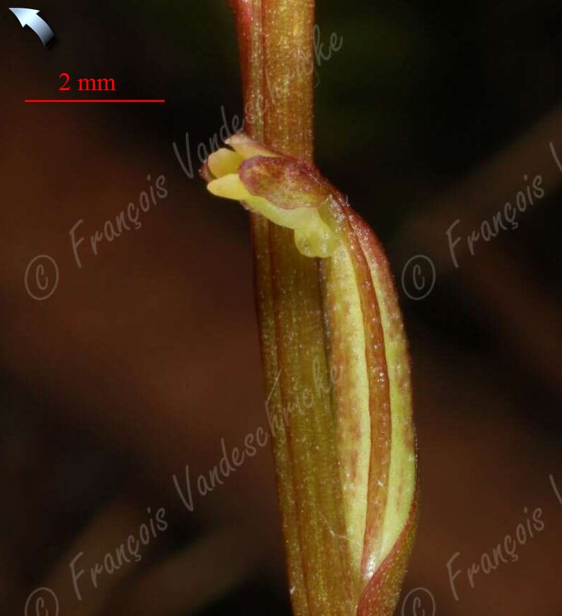 Found in Reunion as a small to medium sized terrestrial with a single, basal, linear, obtuse, basally clasping leaf that blooms in the winter on a terminal, erect, brown, grooved, several flowered inflorescence with much shorter than the swollen, grooved ovary, floral bracts.