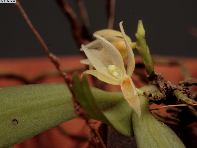 Found in Yunnan province of China and Vietnam in forests on trees at elevations of 300 to 800 meters as a miniature sized, hot to warm growing with basal, oblong-lanceolate, unequally bilobed apically leaves that blooms in the winter on basal, pendulous, .2 to .5" [.5 to 1.2 cm] long, slightly flattened, successively 3 to 6 flowered inflorescence.