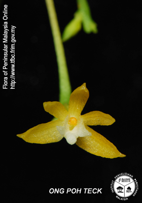 Found in Thailand, penninsular Malaysia and Sabah Borneo at elevations of 200 to 500 meters as a mini-miniature sized, hot growing epiphyte with short stems enveloped completely by imbricating leaf bearing sheaths carrying 5 linear, unequally bilobed apically, acute leaves gradually narrowing below into the leaf bearing sheaths, that blooms in the summer and winter on a basal, very thin, slender, erect, fine prickly, to 1.4" [3.5 cm] long, thickened rachis, few flowered inflorescence with short, broad, spreading floral bracts.