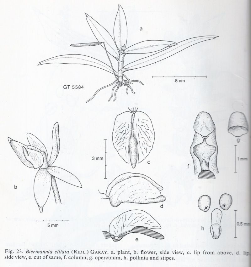 References W3 Tropicos, Kew Monocot list , IPNI ; Flora of Malaya Vol 1 Holttum 1957 as Biermannia ciliata ; The Orchids Of Thailand Seidenfaden & Smitnand 1959 drawing as Thrixspermum sp Cumb pg 526 fig 387 drawing hmm; The Orchids of Thailand Seidenfaden & Smitinand 1965 corrections as Pteroceras ciliatum; Botanisk Tidsskrift bd 68 hft 1 Contributions to the Orchid Flora of Thailand V Seidedenfaden 1973 as Biermannia ciliata drawing fide; Opera Botanica #95 Seidenfaden as Biermanniania ciliata Drawing fide; Rudolf Schlechter Die Orchideen Band 1B lieferung 19/20 1129 - 1264 Brieger 1988 as Biermannia ciliata drawing good; Opera Botanica #95 Seidenfaden 1988 as Biermannia ciliata drawing fide; The Orchids of Penninsular Malaysia and Singapore Seidenfaden & Wood 1992 as Biermannia ciliata drawing good; Wild Orchids of Penninsular Malaysia Ong, O'Byrne, Yong & Saw 2011 as Biermannia ciliata photo fide; Malesian Orchid Journal Vol 17 O'Byrne 2016 photo fide;