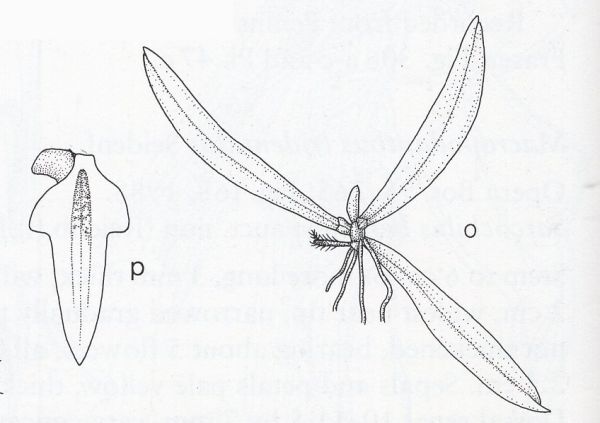 Found in Johor state of penninsular Malaysia as a mini-miniature sized, hot growing epiphyte with about 6,linear, falcate, unequally bilobed apically leaves that blooms on a .28" [7 mm] long, simultaneously 4 flowered inflorescence with flowers similar to B laciniata with pale yellow tepals but without orange spots and a pale yellow with orange at the base lip.