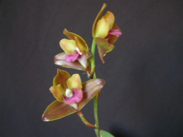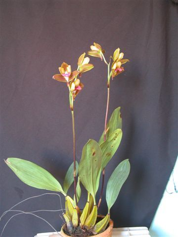 Found in Minas Gerias Brazil in montane rainforests at elevations of 1000 to 1400 meters as a small sized, warm to cool growing, rupicolus orchid with conic-tetragonic, yellowish green, apically dark brown ringed pseudobulb carrying a single, apical, plicate, erect, narrowly elliptic, acuminate, gradually narrowing below into the short, conduplicate, petiolate base leaf that blooms in the fall on a basal, erect, stiff, 9 3/4" 23 cm] long, 2 to 3 flowered, terete inflorescence with sparse amplexicaul bracts and small, broadly lanceolate, acuminate floral bracts.