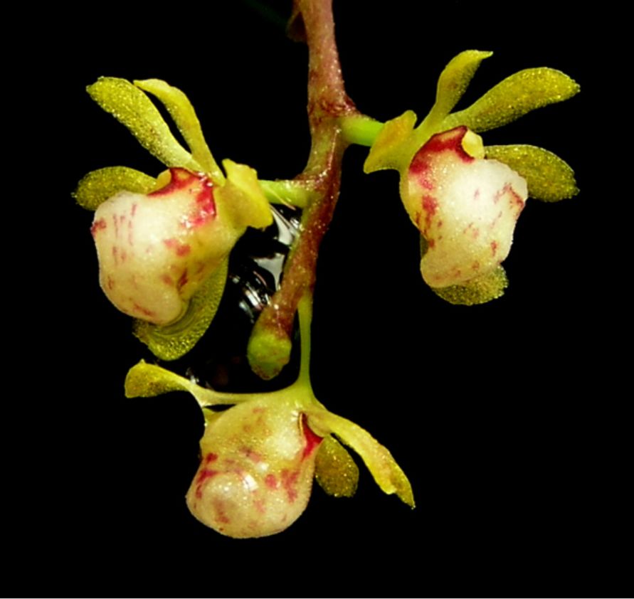Found in New Guinea and Sulawesi in hill forests and on twigs and branches of slender trees within riverine forests at elevations of 500 to 1200 meters as a mini-miniature sized, warm to cool growing epiphyte with a short stem carrying 3 to 5, crowded, oblong leaves that blooms in the fall on a pendent, successively 1 to 4, to 12 flowered inflorescence.