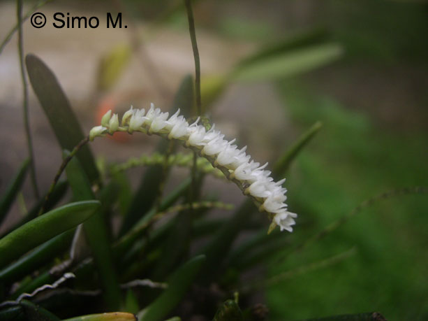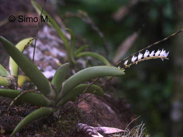 Found in Ghana, Ivory Coast, Gulf of Guinea Islands, Cameroon, Gabon and Congo as a dwarf sized, fan-shaped, hot to warm growing epiphyte with an erect stem completely enveloped by leaf bearing sheaths carrying 6 to 10, arranged in a fan, rigid, fleshy, apically rounded, flattened leaves that blooms in the fall and winter much longer than the leaves, many bracted, slender, racemose, 8 to 10" [20 to 25 cm] long, densely several to many flowered inflorescence.