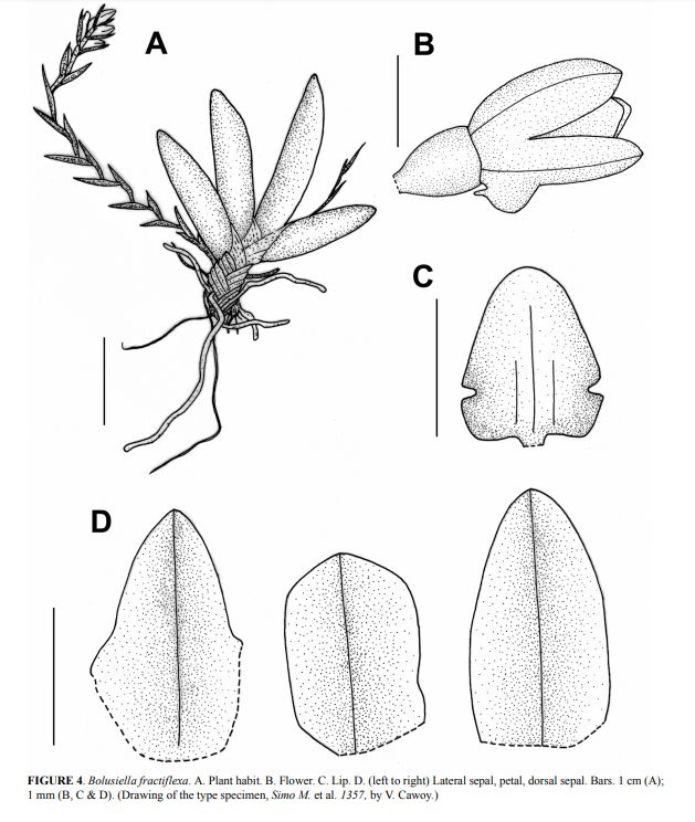 Bolusiella fractiflexa Droissart, Stévart & Verlynde 2013TYPE Drawing by © Murielle Simo-Droissart and Taxonomic revision of the genus Bolusiella (Orchidaceae, Angraecinae) with a new species from Cameroon, Burundi and Rwanda Website