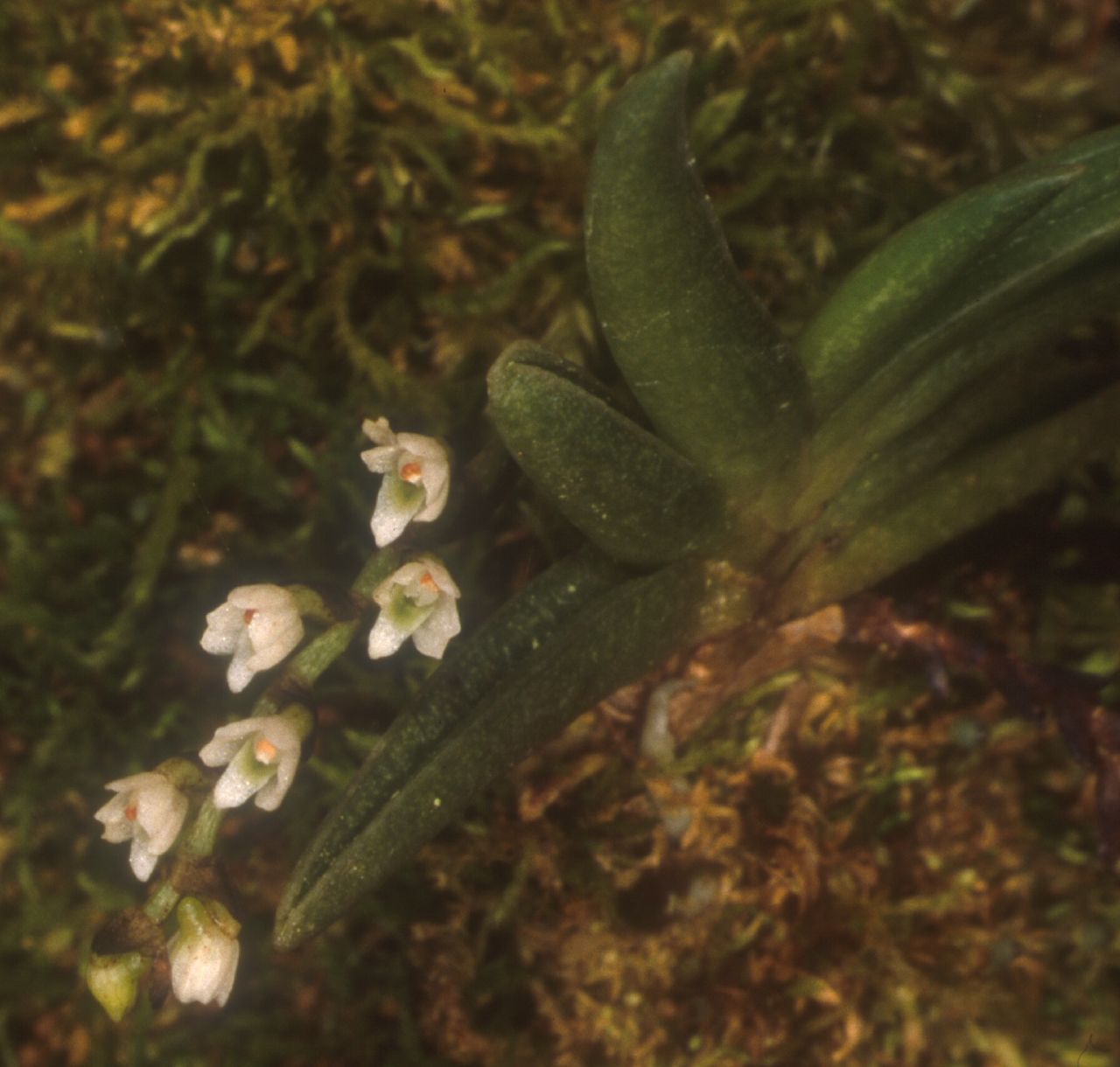 Found in Ghana, Ivory Coast, Togo, Burundi, Central African Republic, Cameroon, Equatorial Guinea, Gabon, Gulf of Guinea Islands, Rwanda, Zaire, Ethiopia, Kenya, Tanzania, Uganada, Angola, Malawi, Zambia, Zimbabwe and the Comoros Islands on twigs and branches at elevations of 950 to 2600 meters as a miniature sized, warm to cold growing epiphye with a short, erect stem carrying 4 to 10, arranged in a fan shape, tapering from base to apex, deep "V" groove on the upper surface, rigid, rather fleshy, glabrous leaves that blooms in the spring on a longer than the 2" leaves, many flowered, slender, racemose, 8 to 10" [20 to 25 cm] long inflorescence with brown small bracts.