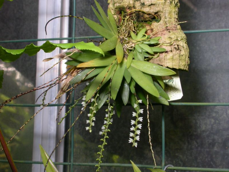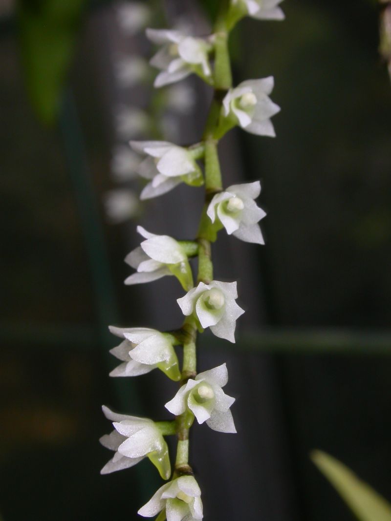 Found in the Congo, Equatorial Guinea, Ghana, Ivory Coast, Liberia, Nigeria, Sierra Leone, Tanzania, and Togo in forests and coffee plantations on twigs and small branches at elevations of 900 to 1350 meters as a miniature sized, warm to cool growing epiphyte with a short stem carrying up to 12, fleshy, sword-shaped, acute leaves that are held in a fan-shape and blooms in the fall through spring on 4" [10 cm] long, somewhat laxly several flowered inflorescence with simultaneously opening flowers.
