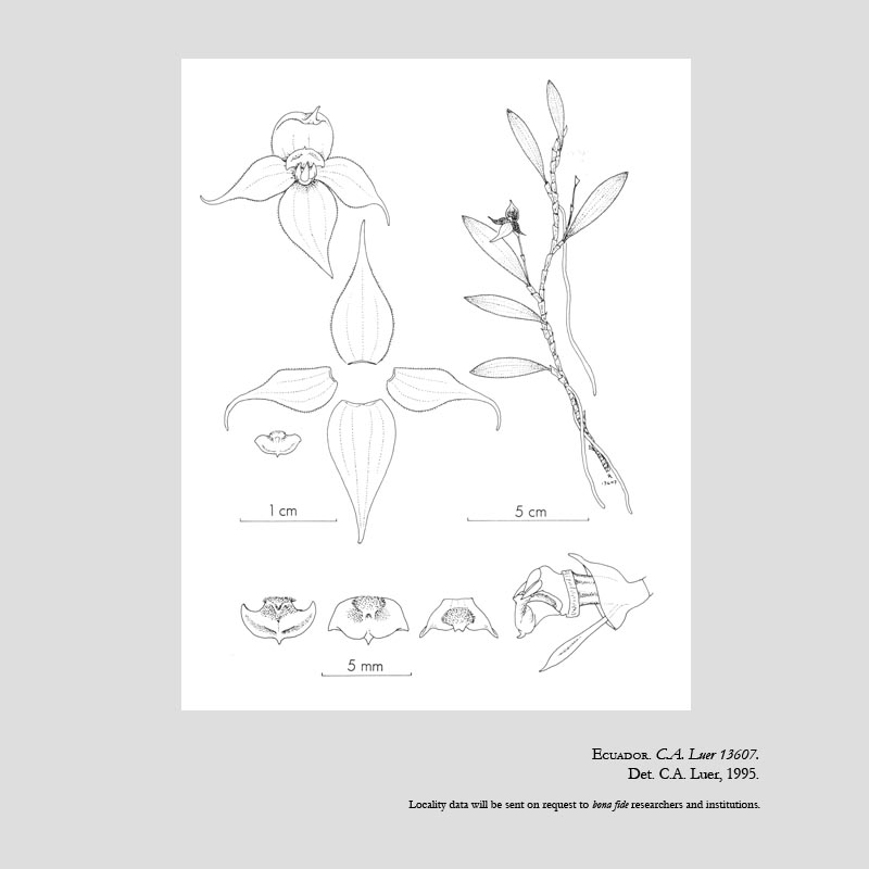References W3 Tropicos, Kew Monocot list , IPNI ; Native Ecuadorian Orchids Vol 1 1994 Dodson drawing/photo fide; *Icones Pleurothallidinarum Vol XII Luer 1995 drawing fide; Flora Of Ecuador # 76 225[2] Dodson & Luer 2005; Orchids of Peru Zelenko & Bermudez 2009 photo fide;