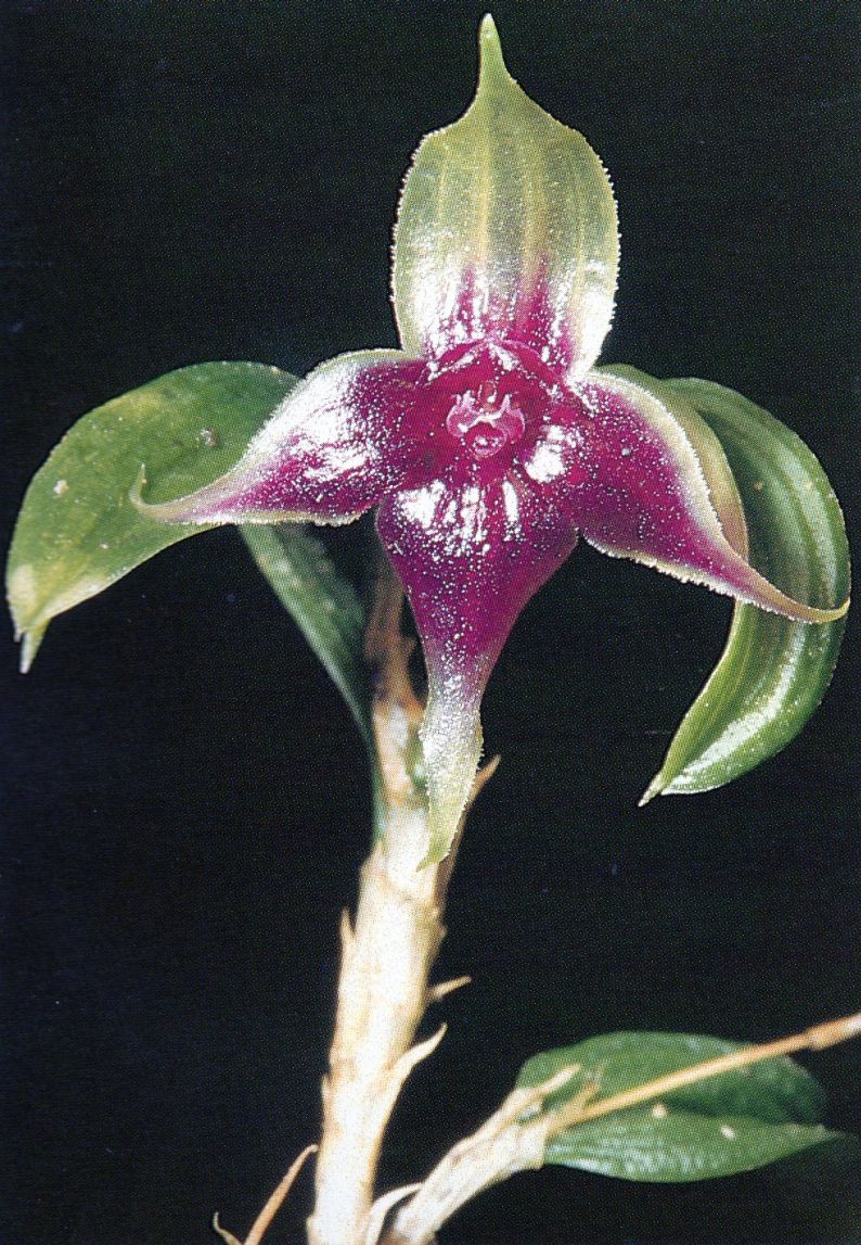 Found in southeastern Ecuador in scrub cloud forests at elevations of 2250 to 2300 meters as a miniature sized, cold growing epiphyte with a stout, occasionally branching rhizome enveloped by 3, tubular sheaths, mucronate apically and giving rise to stout, suberect ramicauls enveloped by 2, tubular sheaths and carrying a single, apical, suberect, coriaceous, elliptical, acute, longitudinally 7 veined, cuneate below into the petiolate base leaf that blooms in the fall on a slender, erect, .8" [2 cm] long, single flowered inflorescence arising from near the apex of the ramicaul, with a loose bract near the middle and another at the base and has an inflated, mucronate floral bract carrying a non-resupinate flower