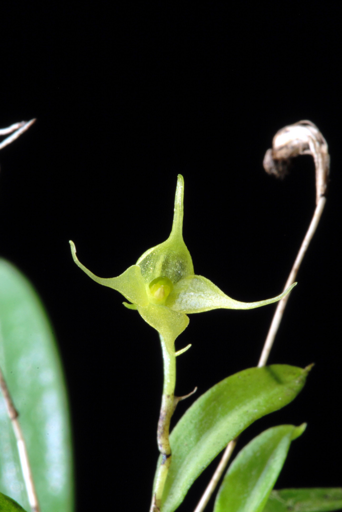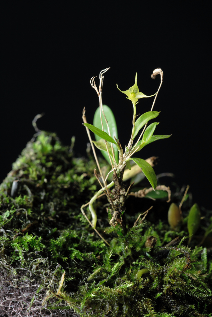 Found in southeastern Ecuador in cloud forests at elevations around 1300 meters as a mini-miniature sized, cool growing terrestrial with suberect to pendant ramicauls enveloped basally by 3 imbricate, long-mucronate sheaths and carrying a single, erect to suberect, thinly coriaceous, elliptical, acute, apiculate, gradually narrowing below into the petiolate base leaf that blooms in the summer on an erect, slender, 1" [2.5 cm] long, single flowered inflorescence with a mucronate bract near the middle and another near the base and a long mucronate floral bract.