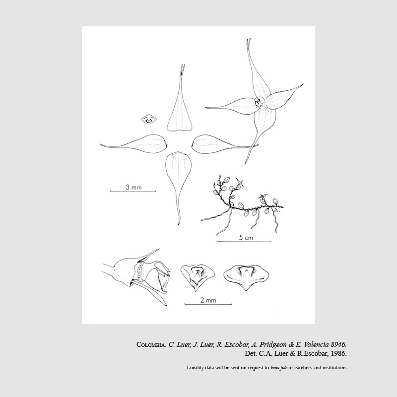 References W3 Tropicos, Kew Monocot list , IPNI ; *Orquideologia Vol 16 #3 1986 drawing fide; Icones Pleurothallidinarum Vol XII Luer 1995 drawing fide; Orchids, A Colombian Treasure Vol 1 Ortiz & Uribe 2014