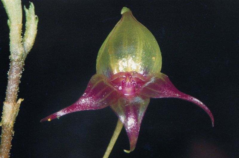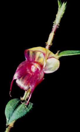 Found in southern Ecuador and northern Peru in scrub cloud forests at elevations around 2400 to 3000 meters as a small sized, cold growing epiphyte with a stout, occasionally branching rhizome enveloped by 3, scurfy, more or less shaggy, tubular sheaths and giving rise to suberect ramicauls enveloped by 2, slightly scurfy tubular sheaths and carrying a single, apical, erect, coriaceous, 7 to 13 veined, elliptical, acute, cuneate below into the petiolate base leaf that blooms in the summer to early fall on a slender, erect, 1.4 to 1.6" [ 3.5 to 4 cm] long, single flowered inflorescence arising from near the apex of the ramicaul, with a loose bract near the middle and another at the base and an inflated, mucronate floral bract