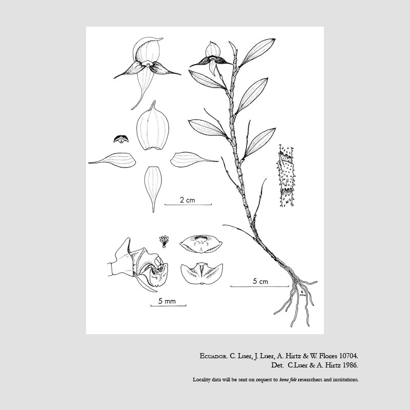 References W3 Tropicos, Kew Monocot list , IPNI ; Native Ecuadorian Orchids Vol 1 Dodson & Escobar 1994 photo/drawing fide; Icones Pleurothallidinarum Vol XII Luer 1995 drawing fide; Flora Of Ecuador # 76 225[2] Dodson & Luer 2005; AOS Bulletin Vol 76 No 12 2007; Orchids of Peru Zelenko & Bermudez 2009 photo fide;