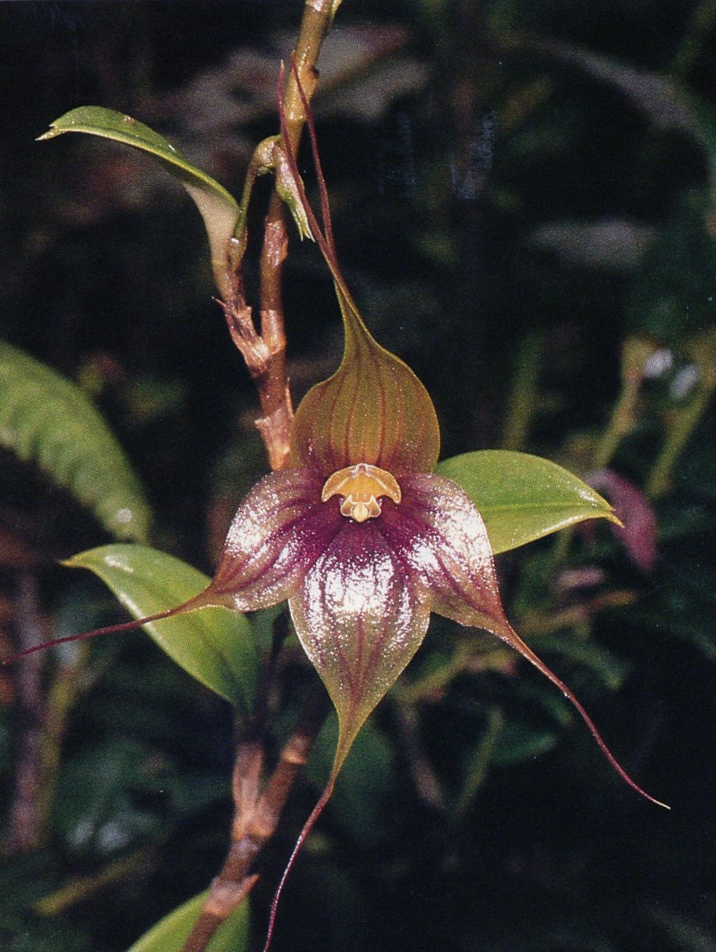 Found in southern Colombia and northern Ecuador in cloud forests at elevations around 3000 to 3300 meters as a small to medium sized, cold growing terrestrial with a stout, branching rhizome enveloped by 2 to 3, distant, smooth tubular sheaths and giving rise to suberect ramicauls enveloped by 2, imbricating, mucronate sheaths and carrying a single, apical, erect, coriaceous, elliptical, acute, multi-veined, cuneate below into the petiolate base leaf that blooms in the late fall through winter on a slender, erect, 1 to 1.6" [2.5 to 4 cm] long, single flowered inflorescence arising from near the apex of the ramicaul, with a bract near the middle and another at the base and an inflated, acute floral bract