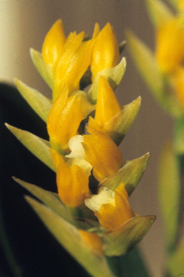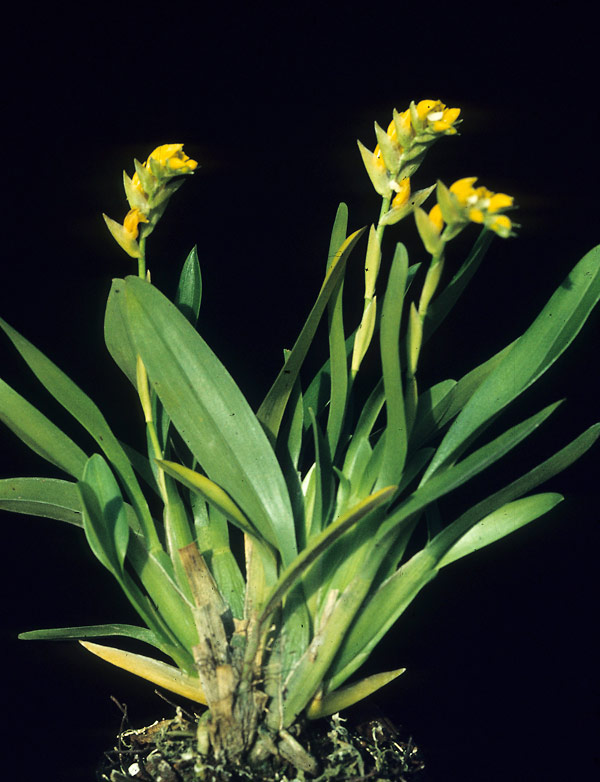 Found in Colombia and northwestern Venezuela at elevations of 1900 to 2000 meters as a miniature to small sized, cool growing epiphyte with ovoid, ancipitous pseudobulbs enveloped laterally by a few distichous, the inner ones leaf bearing sheaths and carrying a single, apical, coriaceous, linear-oblong to linear-oblanceolate, obtuse, carinate dorsally, attenuate and conduplicate basally leaf that blooms on a racemose, axillary, erect to horizontal, 4 to 10.4" [10 to 26 cm] long, few to several flowered inflorescence enveloped by 2 to 3, well spaced, close fitting, acute bracts and has scarious, cucullate, acute, ovate to ovate-elliptic floral bracts.