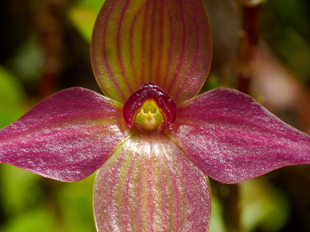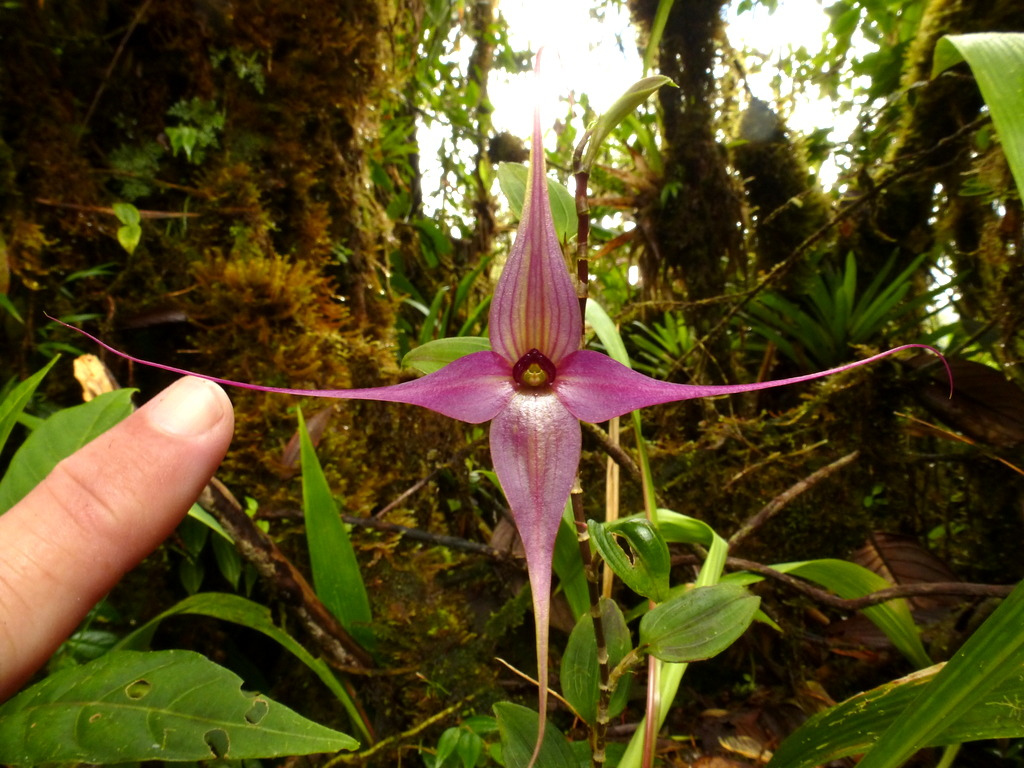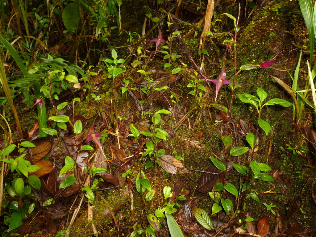Found in west central Colombia and Ecuador in cloud forests at elevations around 2000 to 2600 meters as a miniature sized, cold growing terrestrial on roadbanks or occasional epiphyte in shrubs with a ascending to erect rhizome enveloped by 2 to 3 distant, mucronate, tubular sheaths and giving rise to suberect ramicauls enveloped by 2, similar, imbricating tubular sheaths and carrying a single, apical, erect, coriaceous, elliptical, acute, multiveined, contracted below into the petiolate base leaf that blooms in the winter and spring on a slender, erect, 1.6 to 2.6" [4 to 6.5 cm] long, single flowered inflorescence arising from near the apex of the ramicaul with a bract below the middle and another at the base and an inflated, mucronate floral bract and carrying a non-resupinate flower.