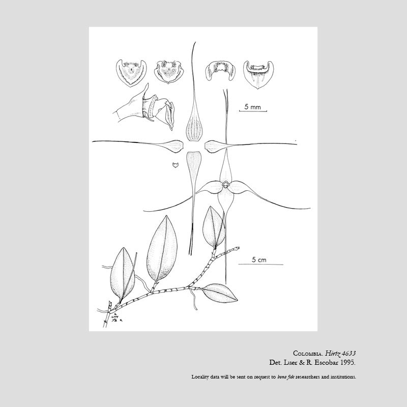 References W3 Tropicos, Kew Monocot list , IPNI ; *Icones Pleurothallidinarum Vol XI Luer 1995 drawing fide; Flora Of Ecuador # 76 225[2] Dodson & Luer 2005; A Compendium of Miniature Orchid Species Parsons & Gerritsen 2013 photos fide; The Orchid Review Vol 127 No 1328 December 2019 photo fide; Orchids, A Colombian Treasure Vol 1 Ortiz & Uribe 2014 drawing/photo fide