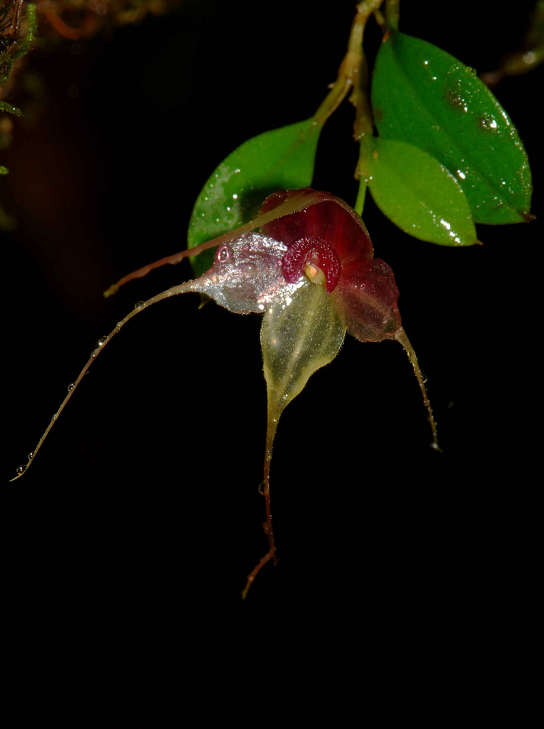 Found in west central Colombia and Ecuador in cloud forests at elevations around 1100 meters as a mini-miniature sized, cool growing epiphyte with an occasionally branching rhizome enveloped by 2 imbricating sheaths and giving rise to suberect ramicauls enveloped by 2 tubular sheaths and carrying a single, apical, erect to suberect, coriaceous, elliptical, acute to subacute, apiculate, 5 veined, cuneate below into the petiolate base leaf that blooms in the fall on a slender, erect, .28" [7 mm] long, single flowered inflorescence arising from near the apex of the ramicaul with a bract below the middle and short, acute floral bract and carrying a resupinate flower.