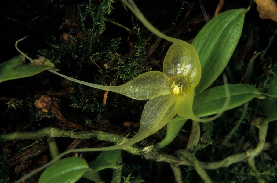 Found in Guate4mala, Nicaragua and Costa Rica in cloudforests at elevations of 2000 to 2400 meters as a small sized, cold growing epiphyte with a slender, long-repent, occasionally branching rhizome giving rise to erect to suberect ramicauls enveloped by 2 similar sheaths and carrying a single, erect to suberect, coriaceous, elliptic, acute, apiculate, 7 veined, cuneate below into the petiolate base leaf that blooms in the late winter and early spring on a slender, .6 to .75" [1.5 to 1.8 cm] long, single flowered inflorescence arising from near the apex of the ramicaul with a bract near the middle and an infundibular, acuminate, emucronate floral bract that encloses the pedicel.