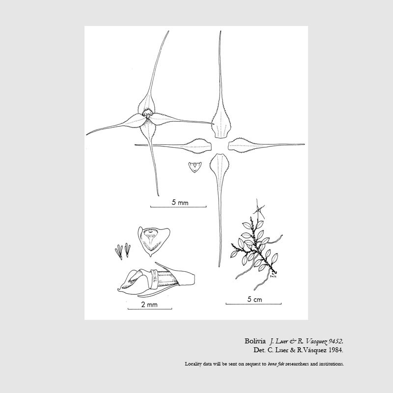 References W3 Tropicos, Kew Monocot list , IPNI ; Icones Pleurothallidinarum Vol XII Luer 1995 drawing fide; Orchids of Bolivia Vol 1 Vasquez & Ibisch 2000 drawing fide; AOS Bulletin Vol 76 No 12 2007; The Parque Nacional Carrasco, Cochabamba Bolivia, Orquideas del Proyecto Hidroelectrico Ivirizu Website 2021 Photo fide