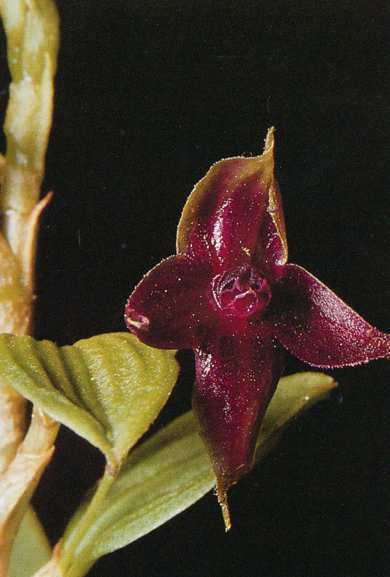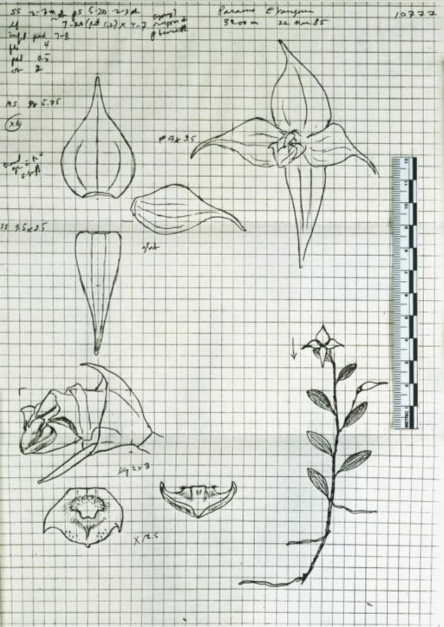 Found in southern Ecuador in cloud forests in scrubby vegetation at elevations around 3200 meters as a miniature sized, cold growing epiphtye with a slender, ascending to erect rhizome enveloped by 2 to 3, minutely mucronate sheaths and giving rise to slender, suberect ramicauls enveloped by 2 similar sheaths and carrying a single, apical, suberect, thickly coriaceous, purple beneath, dorsally longitudinally rugose-verrucose along the 5 to 7 veins, subdenticulate above the middle, elliptical, subacute, cuneate below into the petiolate base leaf that blooms in the late summer and early fall on a slender, erect, .28 to .32" [7 to 8 mm] long, single flowered inflorescence arising from near the apex of the ramicaul with a bract below the middle as well as an inflated, mucronate floral bract and carrying a translucent green veined and suffused with brown, non-resupinate flower.