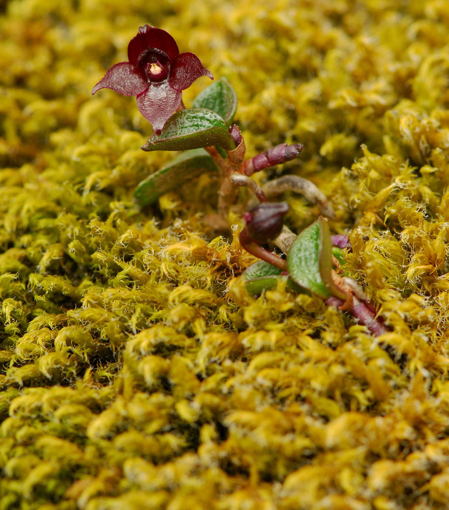 Found in southern Colombia and northern Ecuador in mossy cloud forests at elevations around 3200 to 3800 meters as a mini-miniature sized, cold growing terrestrial with a slender, erect, branching rhizome enveloped by 3, pale, glabrous, loosely fitting, mucronate sheaths and giving rise to suberect ramicauls enveloped by 2 similar sheaths and carrying a single, apical, suberect, coriaceous, elliptical, acute, apiculate, 7 veined, cuneate below into the petiolate base leaf that blooms in the winter through early summer on a slender, erect, .32 to .6" [.8 to 1.5 cm] long, single flowered inflorescence arising from near the apex of the ramicaul with an inflated bract near the middle as well as an infundibular, oblique floral bract and carrying a bright purple, non-resupinate flower.