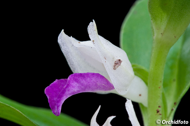 Found in Assam, Myanmar, Thailand and Cambodia in mixed deciduous forests, seasonal evergreen forests, bamboo thickets, and rubber plantations at elevations of 50 to 700 meters as a small sized, hot to warm growing terrestrial with an erect stem enveloped by 4 to 7, lanceolate to linear-lanceolate, acute to obtuse, basally clasping leaves that that blooms in the late spring through summer on an axillary, erect, 2 to 10, short, single flowered inflorescence.