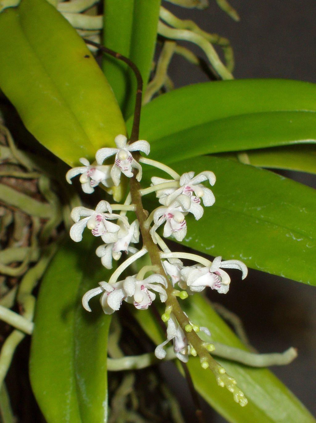 Found only on Christmas Island low down on trunks of large trees at elevations of sea level to 100 meters as a small to medium sized, hot growing epiphyte with a short stem enveloped completely by imbricating leaf bearing sheaths and carrying 4 to 5 strap shaped, often yellowish green, unequally bilobed apically leaves held in a fan shape that blooms in the spring through fall on an axillary, arching, 6 to 14" [15 to 35 cm] long, many flowered inflorescence with crowded, successively opening flowers.
