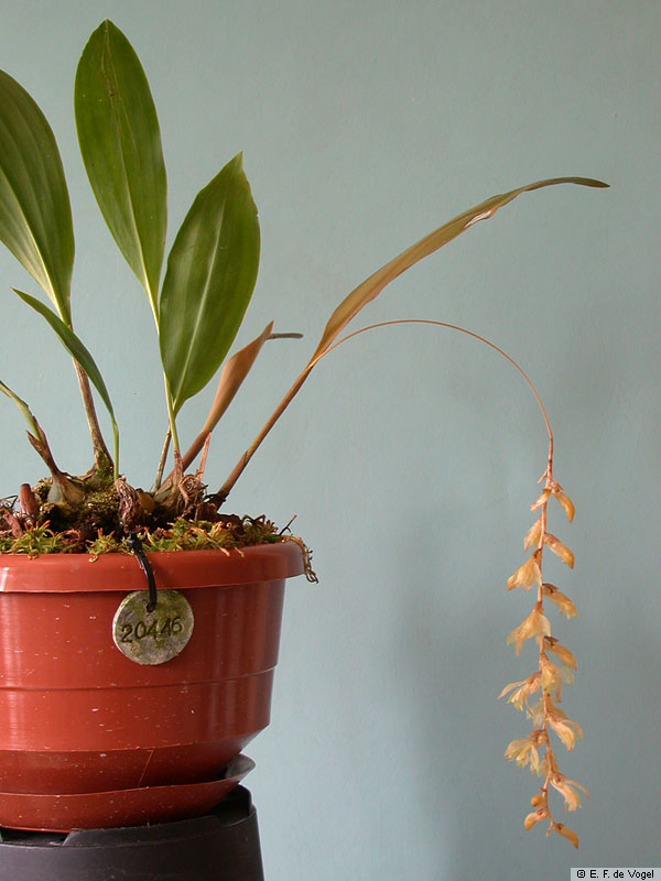 Found in Sulawesi at elevations of 1800 to 2000 meters as a medium sized, warm to cool growing epiphyte on trunks and branches with elliptical, lightly longitudinally sulcate pseudobulbs carrying a single, apical, erect, elliptical, acute, gradually narrowing below into the elongate, thin petiolate base leaf that blooms in the spring and summer on a synanthous, arising with the almost newly developed leaf, erect, thin then arching to pendant, 10" [25 cm] long, 8 to 40 flowered, racemose inflorescence