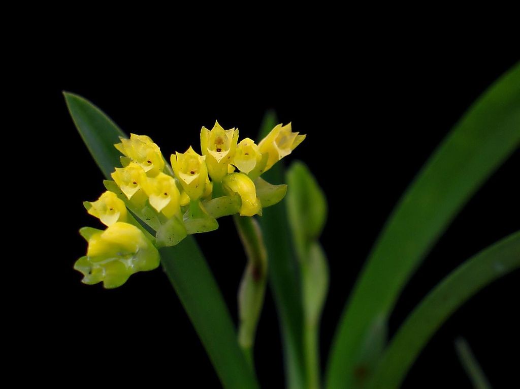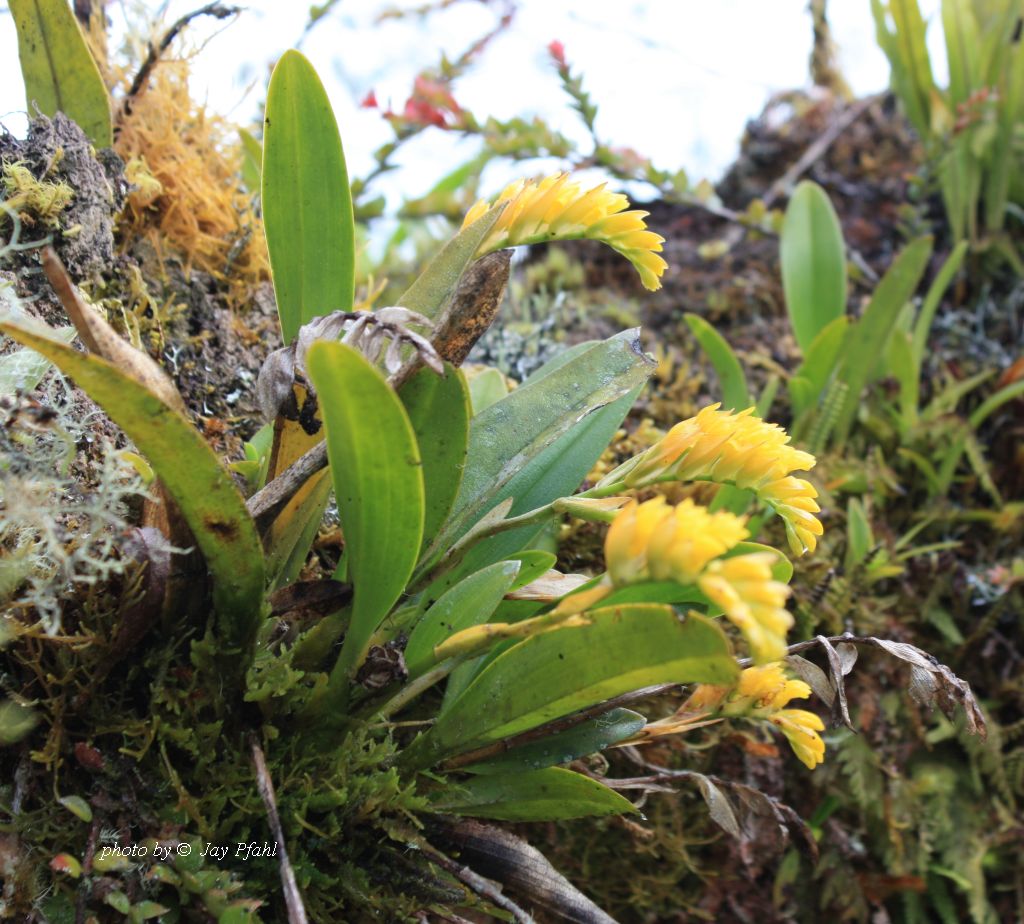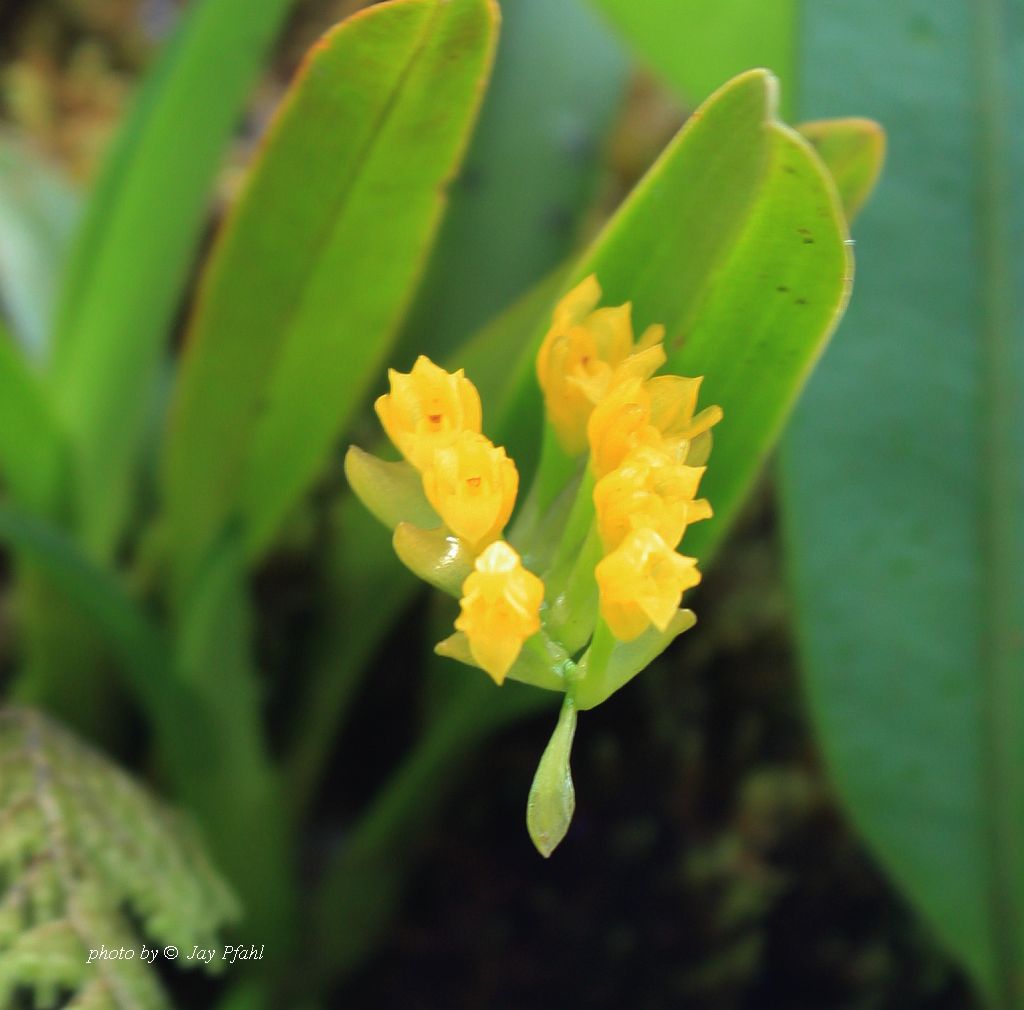Found in Colombia and Ecuador at elevations around 2800 meters as a small to medium sized, cold growing epiphyte with a pseudobulb carrying a single leaf and blooms in the summer with several axillary, erect, 4" [10 cm] long, successive several flowered, complanate inflorescence with imbricating, acuminate, conduplicate floral bracts that are much longer than the ovary.