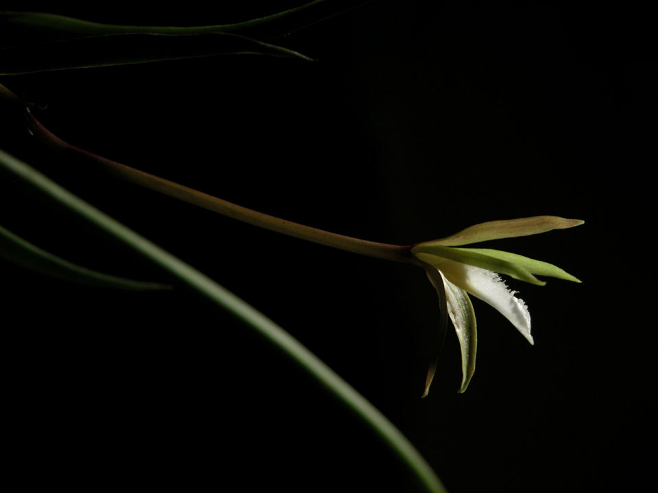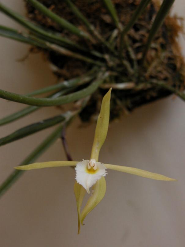 Found in Bolivia, Brazil, Surinam, the Guyanas, Venezuela and Colombia in rain forests often close to rivers as a small to medium sized, hot to warm growing epiphyte occuring at elevations of 50 to 1000 meters with erect to ascending, slender, terete, jointed stems enveloped basally by white, scarious, tubular sheaths and carrying a single, apical, linear, subulate, terete, fleshy coriaceous leaf that blooms from summer till autumn on a peduncle that is borne at the junction of the single leaf and terete stem on a short 3 1/4" [to 8 cm] long, several flowered inflorescence with nocturnally fragrant soapy sweet scented, long-lived flowers.
